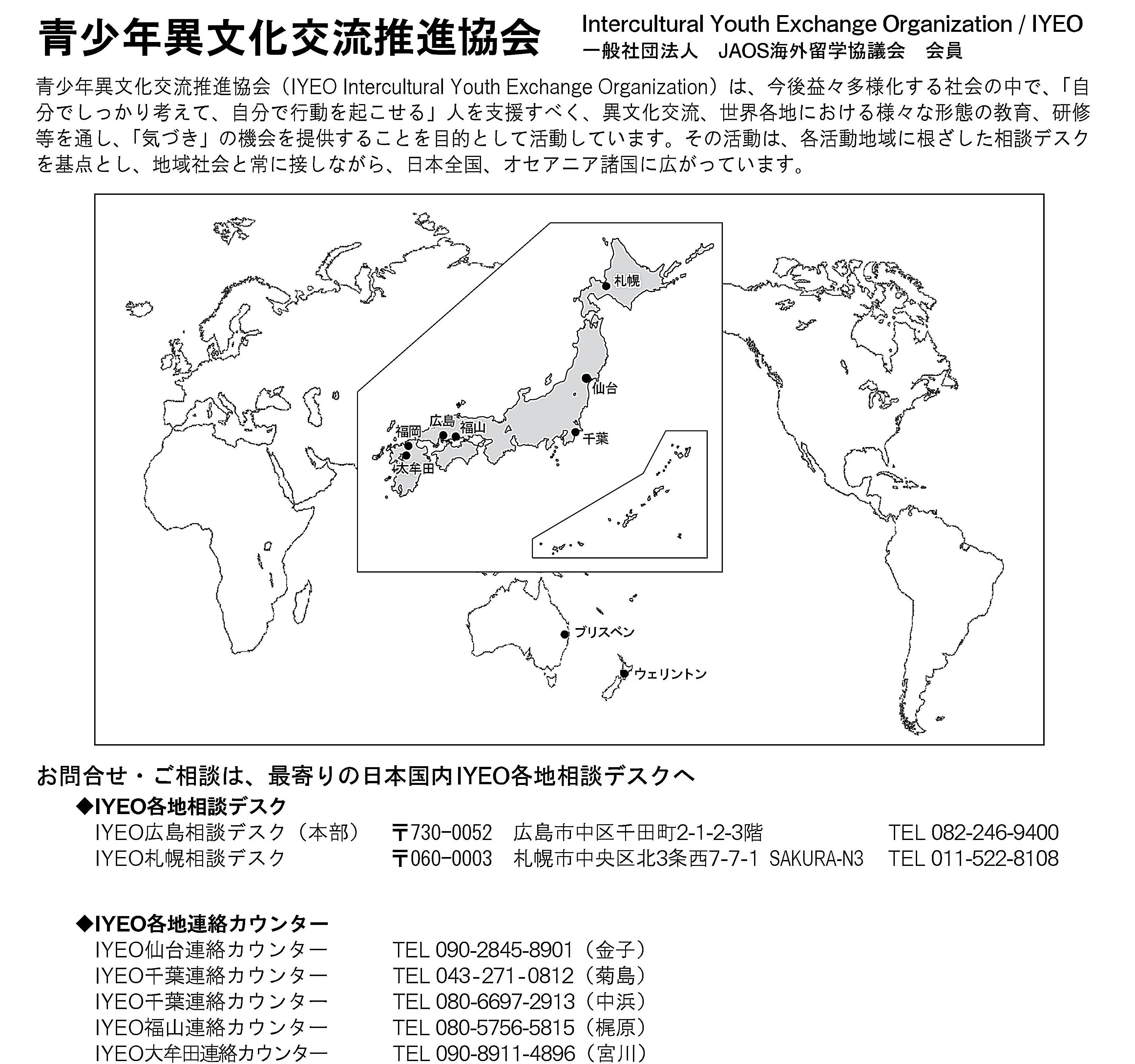 | 国内連絡カウンター | ・IYEO千葉連絡カウンター ・IYEO仙台連絡カウンター ・IYEO福山連絡カウンター ・IYEO福岡大牟田連絡カウンター |